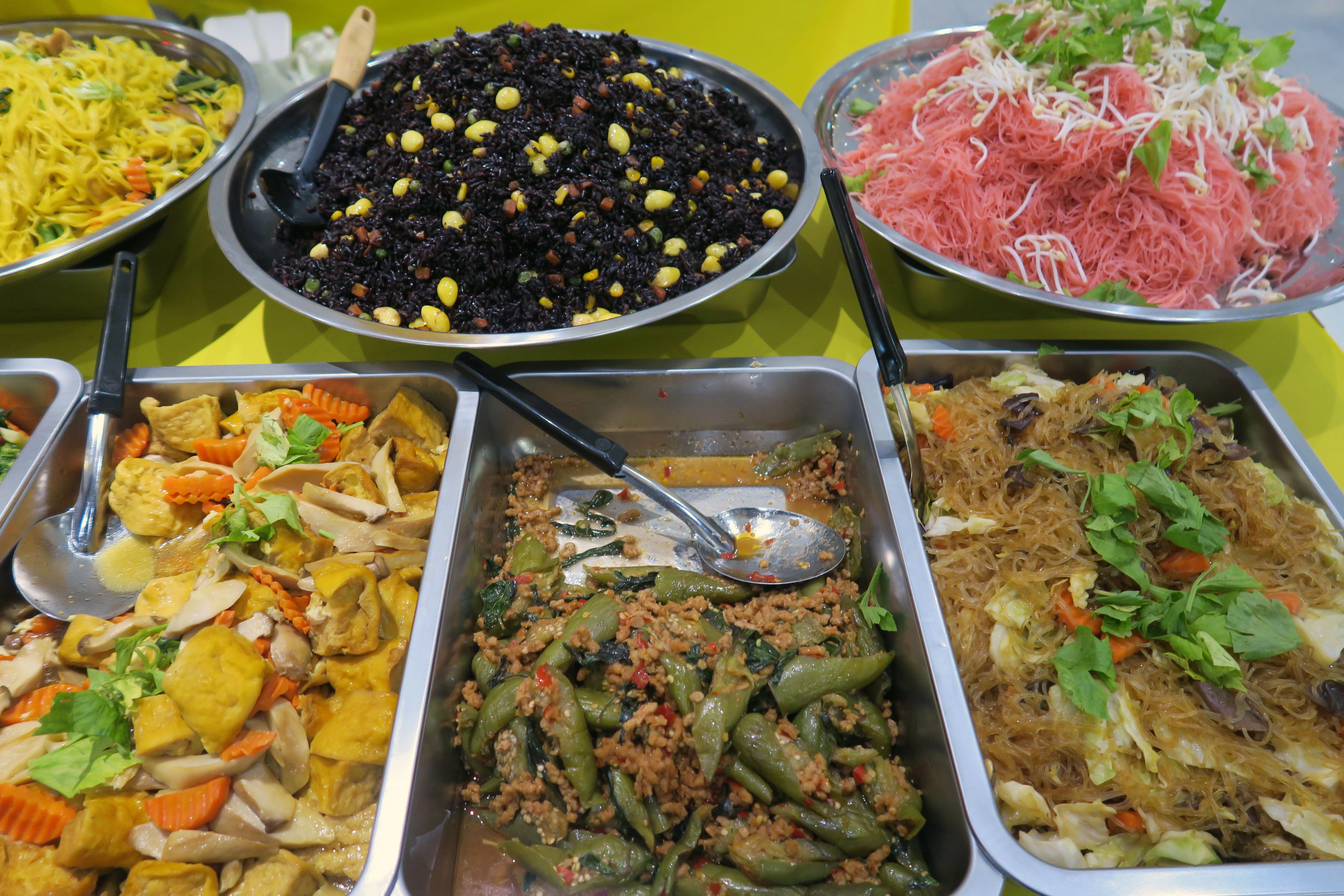 For 259 baht ($7.92,) you get spaghetti with basil sauce, Japanese-style tofu, steamed leafy greens, mushroom soup, and an all-you-can-eat salad bar. Their salad bar is available all year and has a good selection for vegans.
