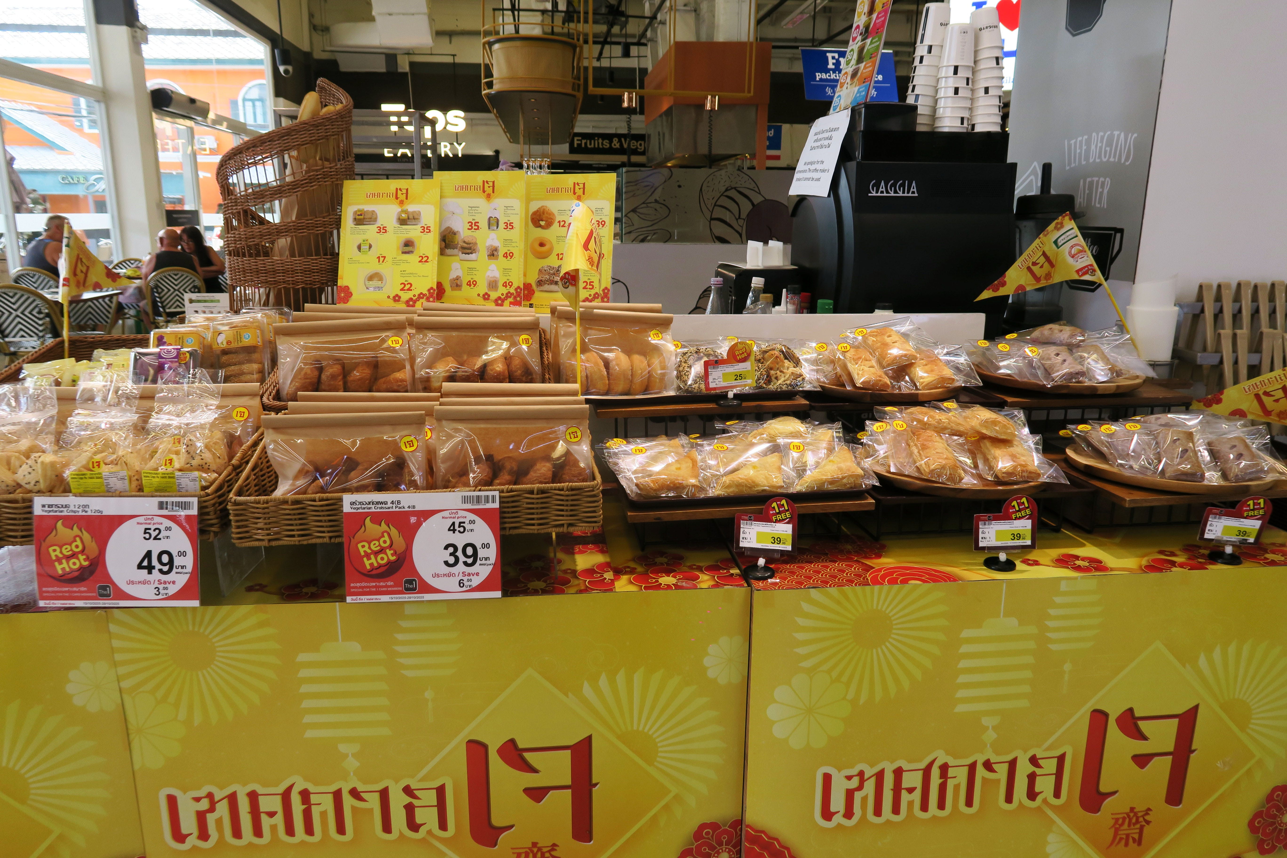 The supermarket not only has an entire table filled with various, delicious, vegan baked goods and large displays of vegan food right at the entrance, but also has a special vegan menu in their eatery with made-to-order food.