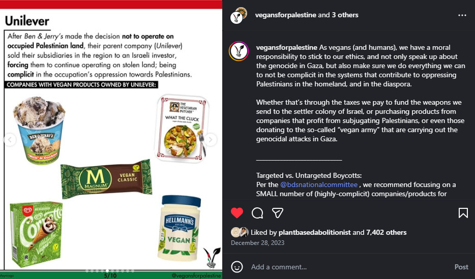 Vegans for Palestine has made some helpful infographics on their Instagram, listing vegan companies to boycott as well as explaining why it’s important to boycott them.